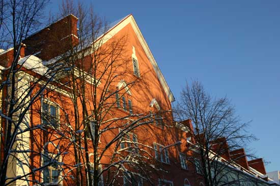 Kattojen takaa näkyy Kalevan kirkko. Tammikuussa oli muutama talvinen päivä, sen verran että kannatti mennä parvekkeelle kuvaamaan. Talvea on saanut taas vaihteeksi odottaa ja hiihtoreissut jääneet haaveeksi. Katso kuva.
