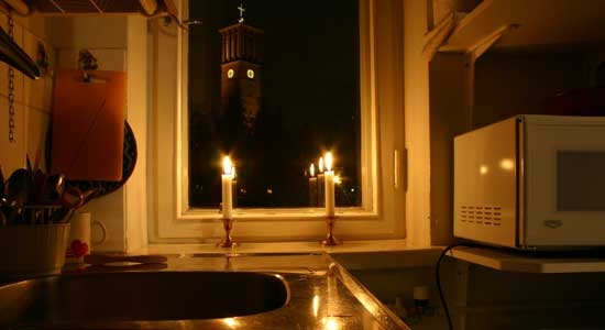 Meillä on hieno joulutähti. Joulun pimeydessä sai hipsiä keittiöön ja juoda teetä pelkän joulutähden valossa. Kuvassa tähti tosin vain heijastuu ikkunasta, muuten se olisi turhan kirkas kuvattavaksi. Katso kuva.