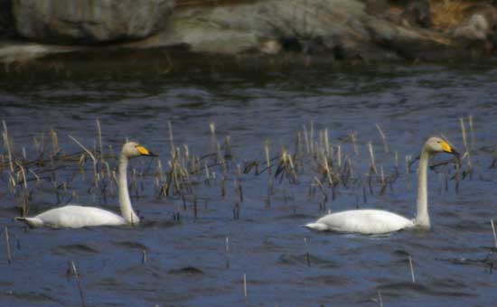 kävi tuuri - joutsenpari oli tuulelta suojassa kaislikkoisessa lahdessa