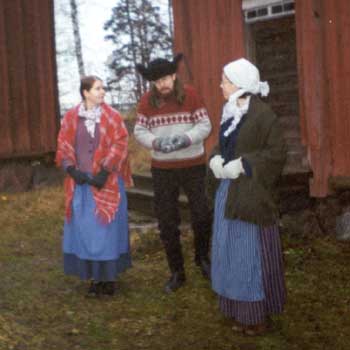"Arkihuolesi kaikki heitä" kertoi pohjalaastaloon juhuluvalmis- teloosta. Taloos ei oo harva takkalaattia ja työt tehtiin ajoos. Niin joutavatkin piiat ja renki aattona tuumaamahan, millaaset hypyt tapanina talossa järjestetähän. Siinä sitten oltihin paistisilla, kankaskauppiaskin kävi ja hypättihin piiriä. Yleisöä piipahti päivän aikana Ivarsin pihassa yli 3 000. Kymmenminuuttinen näytelmä esitettiin seitsemän kertaa, joten katsojia riitti iltaan asti. |