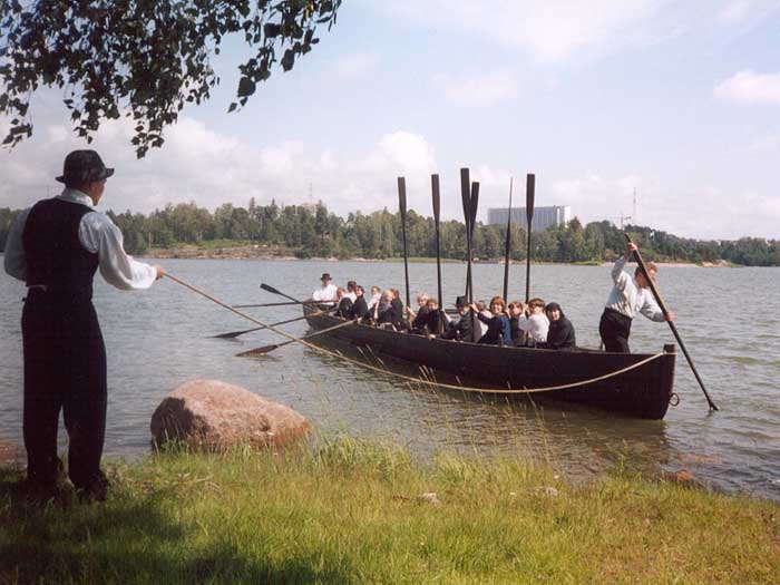 Kirkkovene on juuri tullut rantaan ja tutut tervehtivät toisiaan. Ilma oli tapahtumalle mitä suotuisin, eikä pelätty tuuli pilannut kirkkovenesoutua.