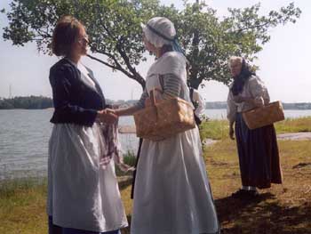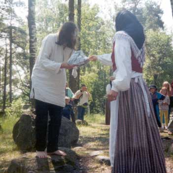 Heinäkuun alussa 2000 esitetty "Pyhäaamun rauha ja mainen häly" ei ollut aivan perinteinen näytelmä. Näyttelijät liikkuivat yleisön seassa, joka samalla muodosti kirkonmäen väen- paljouden. Tarina alkoi kirkkotallilta, jonka luona maita myöden tulleet vaihtoivat kuulumisia. Pian huomattiin kirkkoveneen lähestyvän ja väki vaelsi venevalkamaan sitä vastaanottamaan. Venessä tuli talojen isäntiä, emäntiä ja tyttäriä asioitaan äänekkäästi selvitellen. Väen vaeltaessa kirkolle ryhtyivät vaivaiset kerjäämään ja kyläriidatkin kaivettiin esiin, kun kuudennusmies pisti viinaa keittäneen torpparin ja huonomaineisen naisen jalkapuuhun varoitukseksi. Kirkossa oli perinnejumalan- palvelus vuoden 1694 käsikirjan mukaan. |
